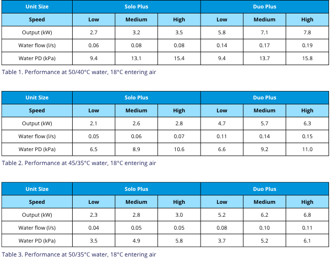 The Solo Plus delivers up to 3.5kW at 50/40°C, making it the right choice for smaller spaces or where a single ceiling tile position is available. Where greater output or larger room coverage is needed, the Duo Plus steps up with more than double the capacity.