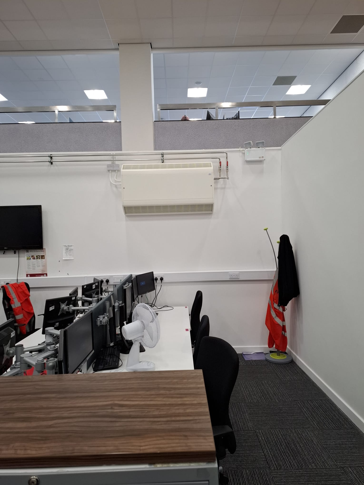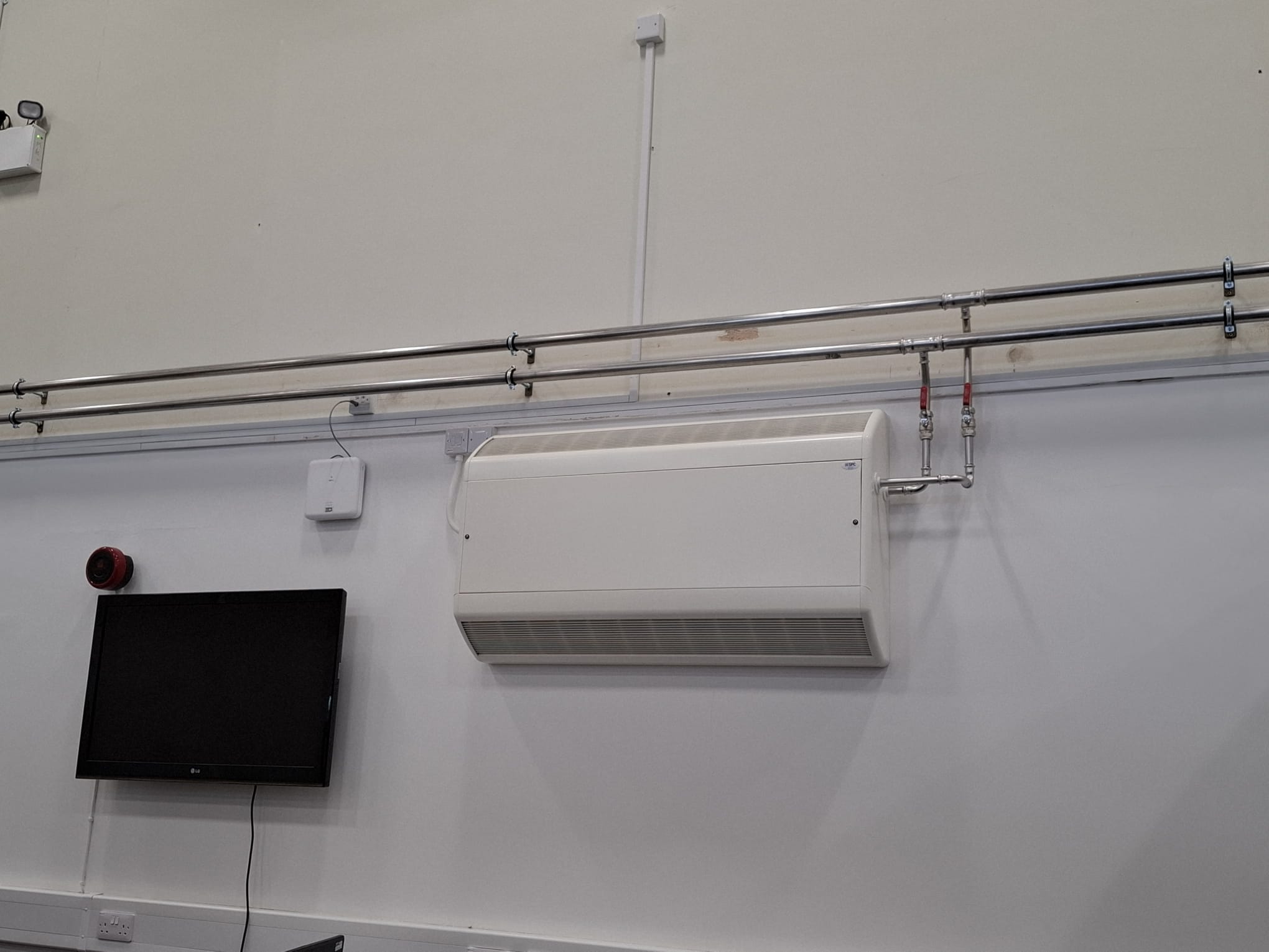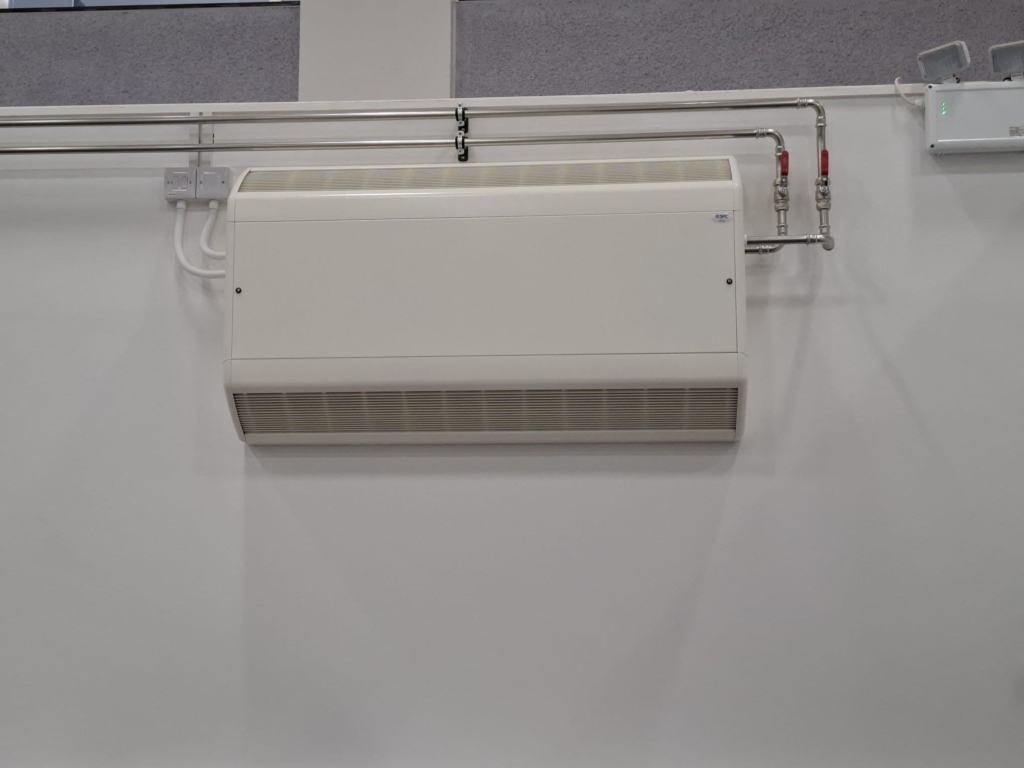 The specification was refined during the project development, with two Tilevector Solo units added to serve the back office area. Chris Ward attended the site during installation to support the contractor and document the wall-mounted fan convectors being fitted.